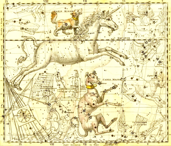 Nyárközép idején ugyanis, az év legmelegebb napjaiban, Kánikula közepette, július 20-a körül évköri járását tekintve egy égi vonalba rendeződik a fejünk felett haladó Nap, a Kiskutya és a Nagykutya – latinul Canicula, vagyis nyári forróság névadójának – csillagképeivel, valamint azok legfényesebb állócsillagaival: a Procyonnal és a Szíriusszal.